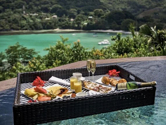 - 5 restauracji: główna Corossol – dania w formie bufetu, kuchnia międzynarodowa; Helios – dania w formie bufetu, kuchnia śródziemnomorska; Adam & Eve – à la carte, kuchnia południowo-wschodnio azjatycka; Cyann – à la carte, kuchnia francuska i azjatycka, w restauracji obowiązuje strój formalny (panowie – długie spodnie); Seselwa – dania w formie bufetu i à la carte, kuchnia lokalna